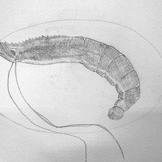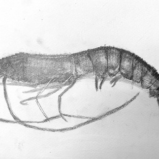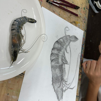 生のエビを見てのデッサンです。 これはモチーフを揃えるのになかなか試行錯誤しました笑。 モチーフ選びは講師みんなでミーティングをして決めるのですが、今回のアイデアで面白いと思ったのがエビ!。これはやってみたい!詳細を見るのも面白いし、丸みや光る箇所など要素が沢山あって子供たちの描いた絵が浮かぶ!決定! しかし頭のついたちょうど良い大きさのエビが近所のスーパーにはなかなかなく(できればブラックタイガーが模様もあっていいと思い)ネットで発注。ガッチガチに氷で固まったエビを各曜日数毎に解凍し、いざモチーフに。 エビをモチーフにしたデッサン作品は検索してもなかなか出てこないのを納得しました笑。 子供たちは手強いモチーフにびっくりするほど集中し取り組んでくれました。毎回思うのですが、本当によく2時間集中して描いてくれるなぁと感心します。