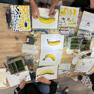 今回のポイントはバナナの影に見える所と上面の明るい所との色分けです。バナナの色は黄色の絵具をそのままではバナナにならないので、ここは何を混ぜれば近づくかの実験をします。どうしても色が作れない時には講師がヒントを出します。