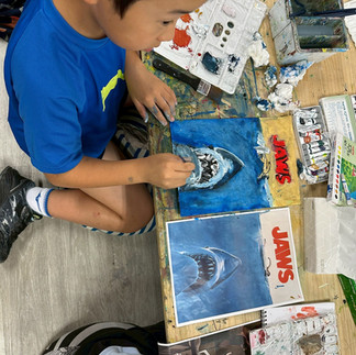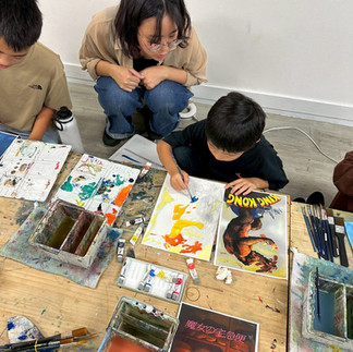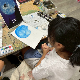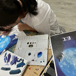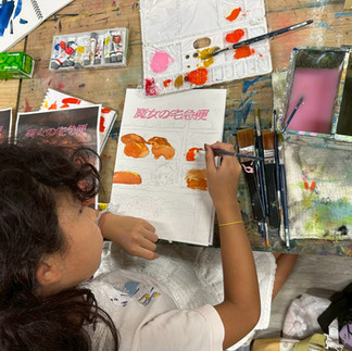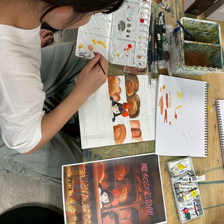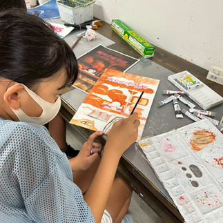 水彩絵具は白の色を残して、薄く感じる色から塗りだんだん濃くするのが基本ですが、これがその通りだけでは無く臨機応変なところもあり、小学生にはなかなか手ごわい課題かなぁと思っていたのですが、子供たちはそれぞれ色の実験をしながらびっくりするくらいの集中をしてくれました。 少しの水彩絵具でも水分ですごく伸びて広い面積を塗れる事や、濃くなりすぎた時の対処法なども実践し、パレットの使い方も上手になってきました。パレットの使い方が上手になってくると水彩絵具と仲良くなってきた印にもなります。