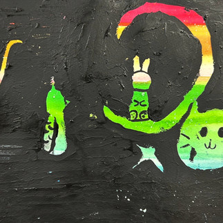 まずは画面を好きな色でランダムに塗ります。今回は横向きのストライプに。幅も自由に、ちょっと曲がっても自由に。ところどころ塩をふってつぶつぶの模様を作ってもOK。部分的に細かい模様を入れてもOK。ティッシュで吸い込んでもOK。4月に水彩絵具の色々な技法をやりましたが、今回はそのどれを使ってもOKとしました。